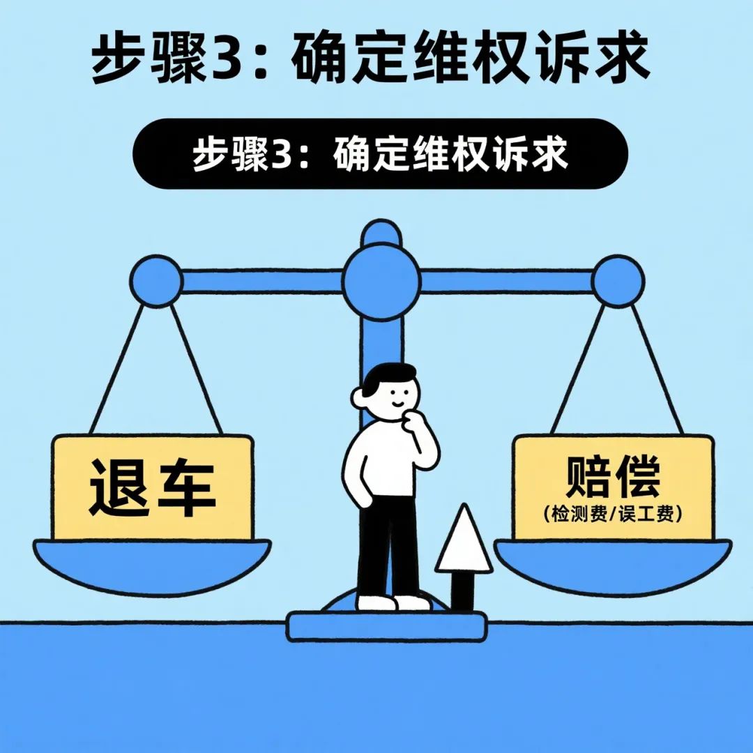 根据问题类型主张退车、赔偿等(包括检测费、误工费等)。
