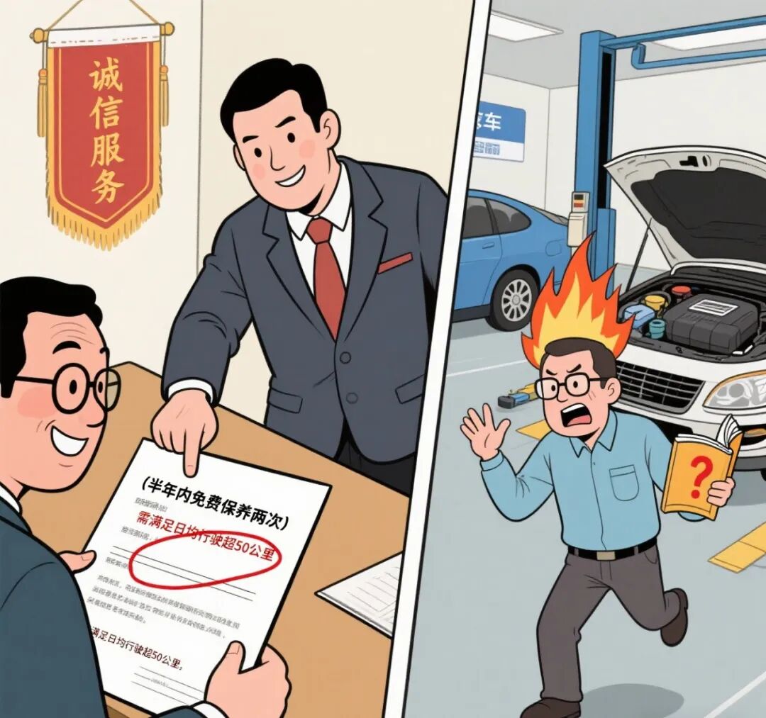 1.承诺不兑现:商家承诺提供一定期限质保、免费维修保养等服务,但车辆出问题时找借口推脱。比如商家承诺购车后半年内免费保养两次,可消费者去保养时,商家以各种理由拒绝,要么说消费者不符合保养条件,要么说保养项目有额外收费。